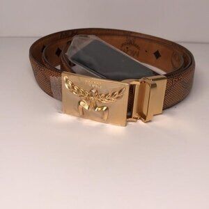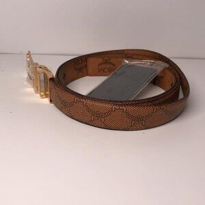 New Authentic MCM Garland Plaque Buckle Print Belt in 24K Gold Plating