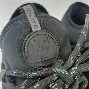 These lightweight, black, Louis Vuitton Fastlane Sneakers feature a one-piece technical knit sock-like construction and a quick lacing system.