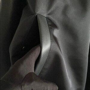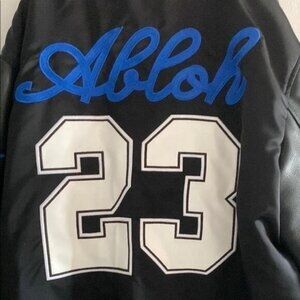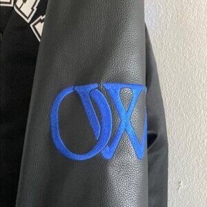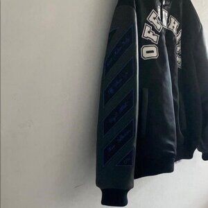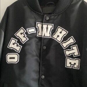 Elevate your style with the Off-White Black Varsity Jacket. This sleek jacket features a classic design with bold branding, perfect for any occasion. The iconic luxury streetwear label draws inspiration from classic varsity aesthetics with this baseball-style bomber detailed with richly pebbled leather. • 27 1/2\\\" length (size 52 EU) • Front snap closure • Blade collar • Front welt pockets • Ribbed cuffs and hem • Lined, with 100% polyester fill • 100% nylon with leather contrast; 45% acrylic, 45% wool, 5% elastane, 5% nylon trim • Spot clean • Made in Romania • Designer Clothing • Black Owned/Founded