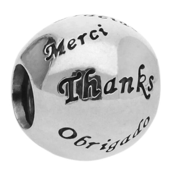 This listing is for a brand new sterling silver Pandora Many Thanks charm bead. This super cool international themed bead has thanks/thank you in several different languages inscribed on it! Words are: