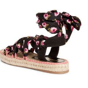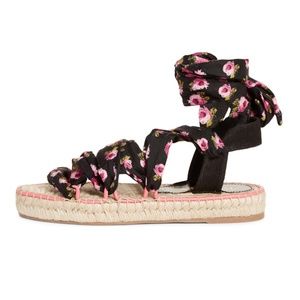Rose-print twill straps lace ghillie-style up the front and wrap the ankle of a sandal set on an espadrille-inspired jute sole.