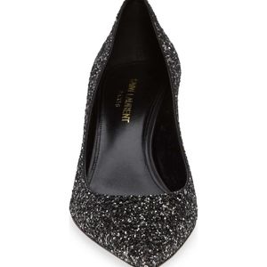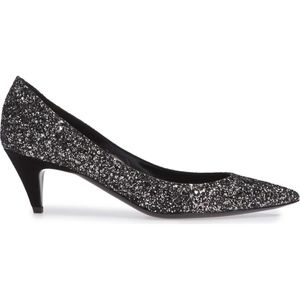 A sleek pointy-toe pump set on a suede-wrapped kitten heel becomes anything but ordinary with an allover encrusting of black and silver glitter.