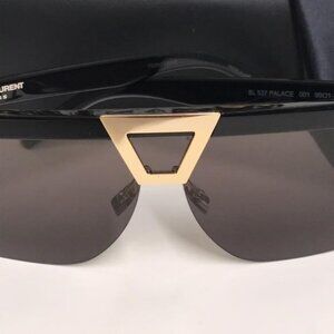 Saint Laurent SL 537 Palace 001 – Black & Gold Shield Sunglasses Defend your look with bold style in these Saint Laurent SL 537 Palace 001 sunglasses. Featuring a sleek black acetate frame with gold accents, these shield-style sunglasses make a statement while providing full protection. Details: • Frame Color: Black with Gold Accents • Frame Material: Acetate with Metal Details • Lens Color: Grey Smoke • Lens Width: 99 mm • Bridge Width: 1 mm • Temple Length: 145 mm • Shape: Shield • Gender: Unisex • UV Protection: 100% UVA/UVB Condition: New, 100% Authentic Includes: Original Saint Laurent case and cleaning cloth Perfect for elevating any outfit with a luxurious, contemporary edge.