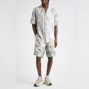 Versace short sleeve shirt in gray and blue with intricate patterns. New Authentic Versace Baroque Seascape Silk Camp Shirt Dive into Versace’s signature luxury with this stunning silk camp shirt. Featuring a vibrant seascape of starfish and coral intertwined with the brand’s iconic baroque swirls, this piece captures effortless vacation glamour. Crafted in Italy from lustrous 100% silk, it’s lightweight, bold, and timelessly stylish. Details: • Design: Baroque Seascape print with starfish and coral motifs • Style: Camp shirt with notched collar and short sleeves • Closure: Front button • Material: 100% Silk • Care: Dry clean only • Made in Italy Condition: New with tags / New Authentic Category: Designer Clothing Style It: Perfect for any occasion — dress it up or down with ease. • Pair with white linen pants or tailored shorts for a vacation-luxe look. • Layer open over a plain tee with black jeans for street-chic style. • Tuck into slim trousers with loafers for a refined evening outfit. • Or wear open over swim trunks with slides for a beach-to-bar vibe. A true statement piece that brings Versace’s bold Italian glamour to any outfit.