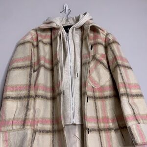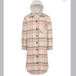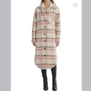New Avec Les Filles Checked Longline Hooded Shirt Jacket Pink Cream Plaid nwt M
