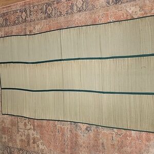 Enjoy your leisure time with this stylish green and tan straw mat. Perfect for indoor or outdoor.