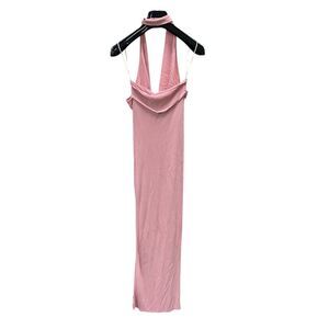 Smoke free, pet free warehouse. New without tags, has string from tag attached but the paper tag came off, retail $750. Stretchy knit jersey fabric. Maxi length. Slit down one side. Draped cowl halter neck with a button close high neck collar. Open strappy back. Light baby bubblegum pink color