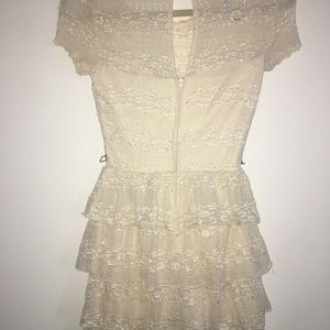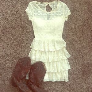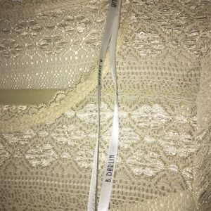 BRAND NEW! Never Wore. Received as a gift from Macy's and was too small. Size 3/4 Women's. beautiful Cream Lace and Ruffled Dress. Would look amazing with a pair of Cowboy Boots and Jean Jacket. Put Free People for exposure