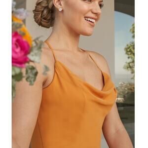 This splendid poly chiffon A-line gown features a flattering spaghetti strap cowl neckline with delicate pleats that enhance every shape. The soft skirt flows gracefully from the high hip with hidden pockets, while the halter back reveals a chic spaghetti strap design that dips into a gentle V-back.