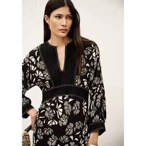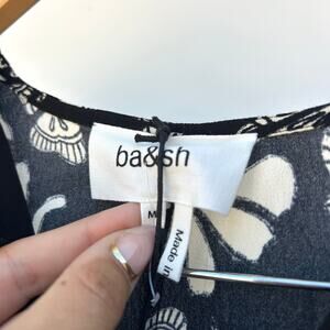 Elegant and effortless BA&SH Paris “Aude” dress crafted from airy viscose. Its black and white floral pattern and relaxed bohemian shape embody the label’s signature French-girl sophistication. Perfect for resort getaways, city strolls, or summer parties—style with woven tote and strappy sandals for timeless modern chic.
