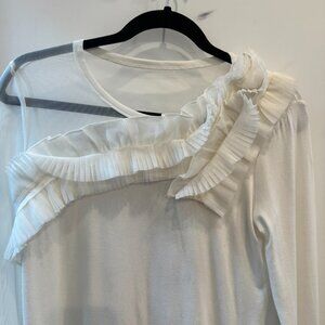 Brand new long-sleeved top features prominent ruffle details, especially on one shoulder/neckline area with a sheer sleeve.