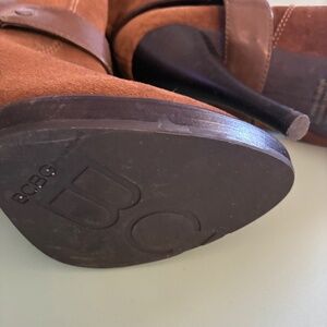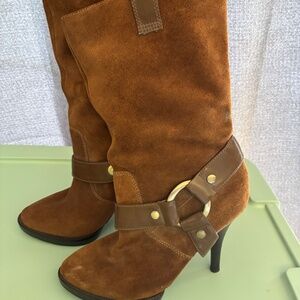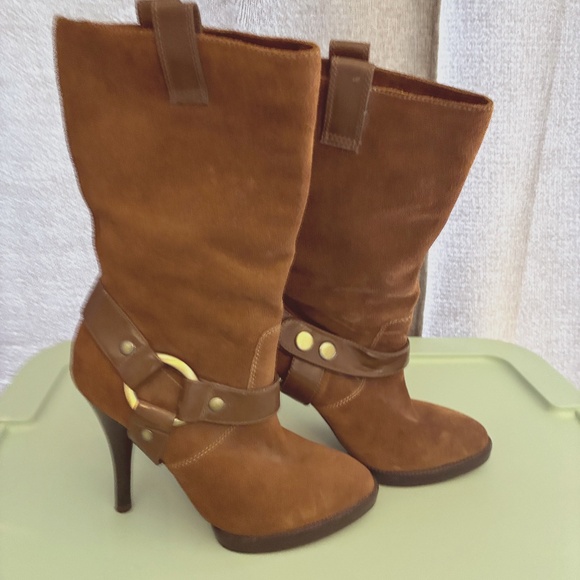 New BCBG Taupe brown tan Suede Slouch mid HighHeeled Boots Y2K style 7.5