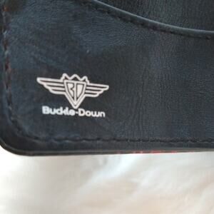 New Buckle Down Grateful Dead black Bi-fold wallet contains interior card slots, clear ID sleeve and billfold. Approx. Dimensions (w) 4.25in. X (H) 3.5 in. Comes with metal type case. Vegan leather.