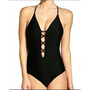 Plunge neck. Low scoop back. Adjustable cross cross straps. Cross strapping in the front. Soft removable pads with elastic under the bust.