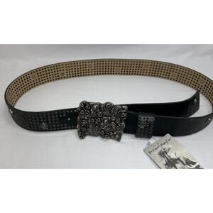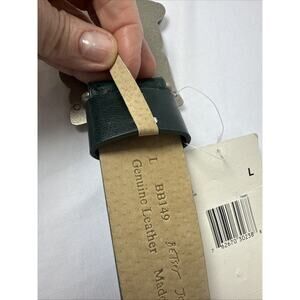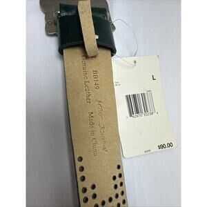 The product is a stylish Betsey Johnson studded rose buckle leather belt in size L. The belt features a solid green color with studded accents and a rose-themed buckle, adding a unique and edgy touch to any outfit. Made from high-quality leather in China, this belt is a fashionable accessory for women looking to make a statement with their wardrobe choices.
