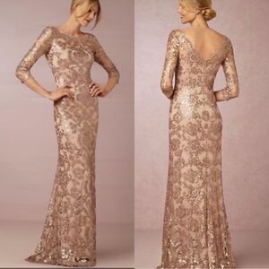 New BHLDN Tadashi Shoji Yvonne Rose Gold Sequined Lace Gown