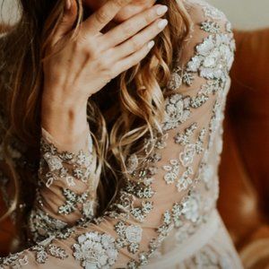 Long, sheer sleeves & a high neckline balance this embellished dress' knee length cut. Bold blossoms, burnished beads & a bevy of sequins bring a glistening, boho air.