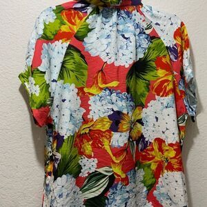 New BOHO CHIC Button Front Blouse multicolored flowers Hawaiian