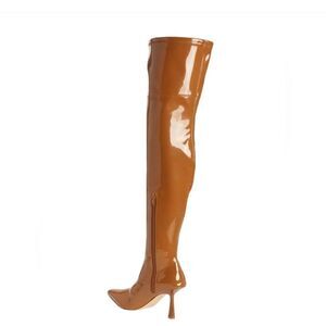 Prepare to have all eyes on you as a high-shine patent finish elevates the glam factor of this sleek over-the-knee boot set on a flared heel.
