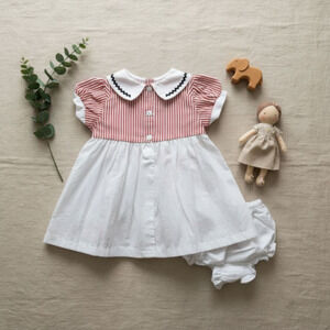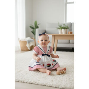 Set sail in style with this adorable nautical-themed baby dress from We’re Kids. Featuring charming red-and-white stripes, a sailor-style collar, and cute embroidered boats and sea details, this outfit brings a fresh and playful coastal vibe to your little one’s wardrobe.