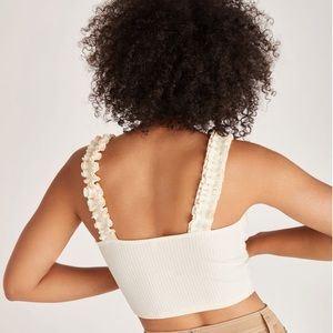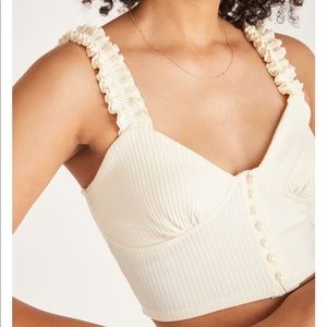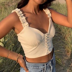 Our off white Dacey Ruffle Top that fits true to size with a flattering cupped bustier that can be paired any denim bottoms for a perfect day look in the city.