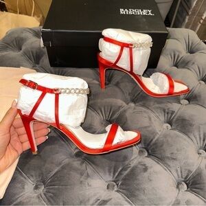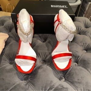 New in box. Badgley Mischka Kai Ankle Strap Sandals. Originally $198. In the color red satin.