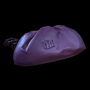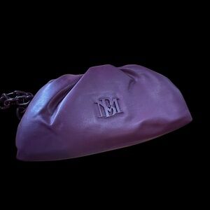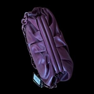 Vegan leather that is buttery soft in a beautiful plum color. Can hold a lot of stuff, wide top opening. Adorable chain.