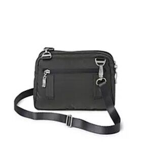 Triple Zip bag functions as a crossbody, wallet bag, or waist pack with features six credit card slots, multiple zippered pockets and removable 52” adjustable strap.