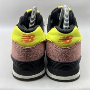 Color: Beige and cream mesh and suede upper with pink suede heel, neon yellow tongue and heel accents, orange "N" logos, black and white midsole, black outsole.