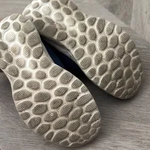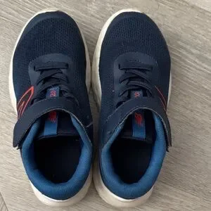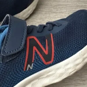 Very lightweight toddler shoes. Navy blue mesh material. Padded blue collar for comfort. Red New Balance logo accent. Cushioned white sole for everyday play. Easy Velcro closure.