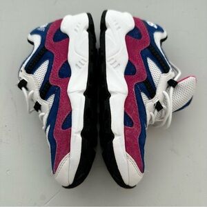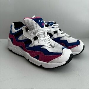 Retro-inspired sneakers offering both style and performance. These shoes feature a colorblock design with a white mesh base accented by vibrant blue and pink suede overlays. The padded collar and tongue provide added comfort, while the durable outsole offers excellent traction. Perfect for casual wear, running errands, or hitting the playground.