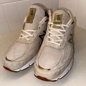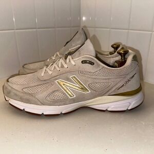 The New Balance 990v4 OFF WHITE GOLD. New pairs go for 400+ This particular model, the M990AG4, is made in the USA. The upper is constructed with a combination of suede and perforated detailing. The shoe incorporates New Balance's signature cushioning technology for superior impact absorption and support. The iconic 'N' logo is prominently displayed on the sides, adding to the shoe's classic aesthetic. Shoes have minor signs of wear. Not New.