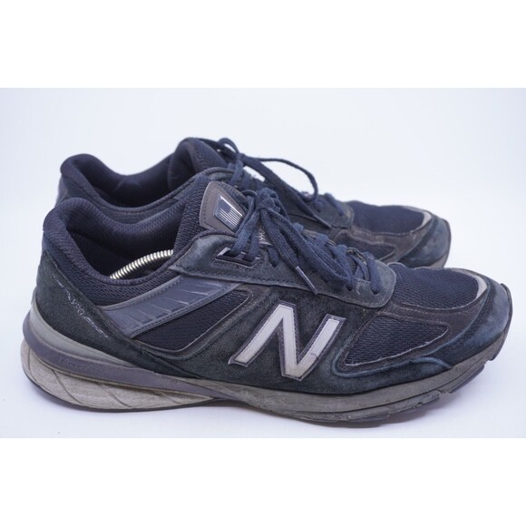 This is a pair of New Balance 990 v5 sneakers in size 12.5 2E EE for men. They are made in the USA and feature a black color with a white logo. The shoes are designed for running and walking, with a suede upper material and a classic sneaker style. These shoes were released in 2019 as part of the New Balance 990 product line.