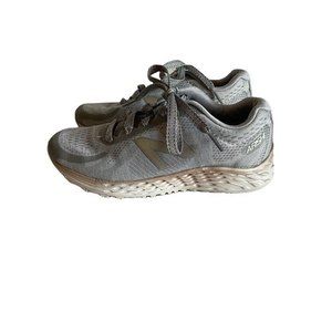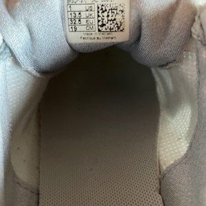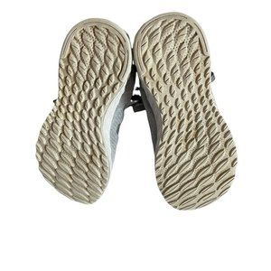 New Balance Arishi Girls Size 1 is a silver gray color with a white sole that has lavender sheen on the sole sides.