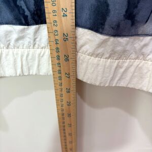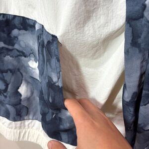 Features: New Balance Blue/Ivory Windbreaker Runner Jacket. Half Zip. Tie-Dye/Camo print. Hooded. Kangaroo pockets.