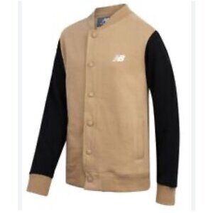 This is a New Balance Boys Fleece Bomber Jacket in size XL 18 / 20. The jacket features a colorblock design in tan and black, with a classic fit and long sleeves. It is made of a cotton blend fleece fabric and has a snap closure. This jacket is suitable for travel, activewear, and casual wear, with accents of the New Balance logo. It is machine washable and has collarless design with pockets.