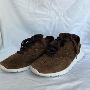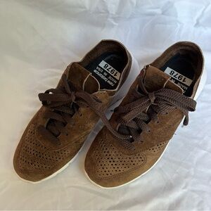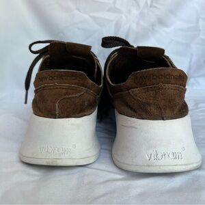 Stylish brown suede sneakers featuring white soles and lace-up design.