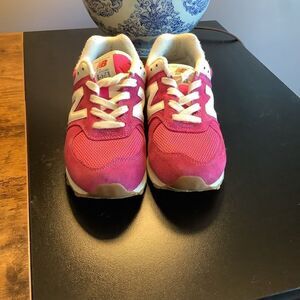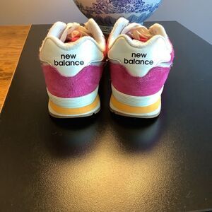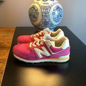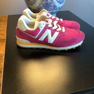 Adorable, hot Malibu Pink classic New Balance Tennis Shoe. Sueded accent uppers with contrasting white and orange accents. Terry cloth insole lining to heel area does have some tiny pilling of fabric, otherwise, shoes are in great preowned condition. Size 4.