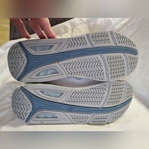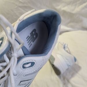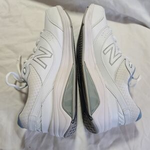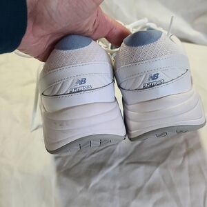 white new balance leather lace up casual comfort walking shoes. size 11. in lightly used condition. see pics for details of condition. absorbs impact.