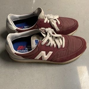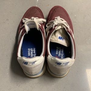 New Balance Comp 100s. Had them about 8 months and wore them around a big city (Rome). Good condition but some stains that show wear. Maroon with grey and light blue detailing. Really pretty and comfortable. US 8.5 but fits more like a 9.