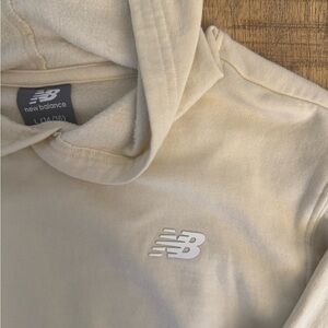Classic New Balance hoodie in off-white. Features a cozy hood and front pocket. Ideal for everyday wear.