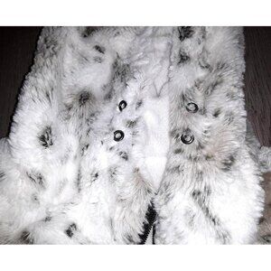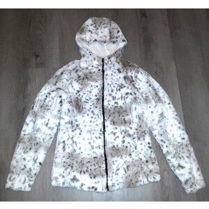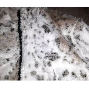 Women's New Balance faux fur plush white snow leopard print zip up hoodie jacket/hooded coat. Size SMALL. Full zipper closure. Pockets on the sides. ***PLEASE NOTE*** The drawstring is missing from the hood. Other than that, very good condition. No stains, holes, or rips.