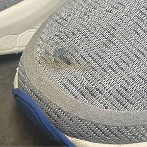 1) the left shoe has a successfully repaired tear on the top toe section of the shoe