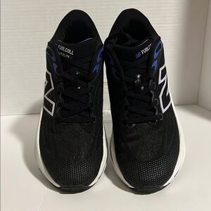 Stylish black sneakers with white and blue details. Ideal for running and sports.