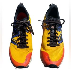 Step into performance with New Balance's athletic shoes, featuring a vibrant yellow and orange color scheme. Designed for outdoor adventures, these shoes boast rugged soles with substantial treads and durable mesh uppers for breathability and support.