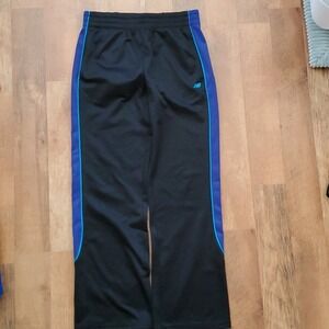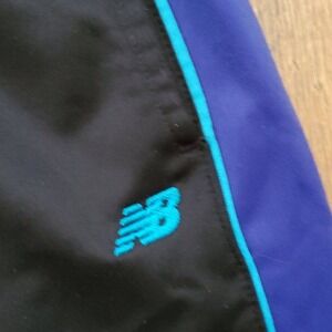 Black with a purple stripe and edged in turquoise, these pants for girls by New Balance are a slick athletic material. Elastic waist. Approximate waist measurement 13.5", length 36.5", rise 10", inseam 27.5in. Excellent condition. Two front pockets.