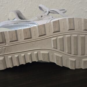 Experience the perfect blend of style and comfort with these New Balance sneakers. Crafted in a sleek gray and silver colorway, they feature a classic retro design with a suede and mesh construction. The traditional lace-up style and rugged traction outsole make them ideal for both casual and athletic wear. Small discoloration