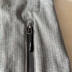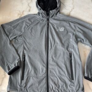 Heather gray jacket with zip closure. Features New Balance logo on chest. Includes hood and zip pockets.
