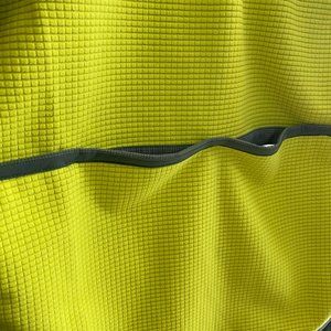Very comfortable running jacket that is stylish enough to wear if you like athleisure style. It is in perfect condition. It has only been worn twice, because it isn't a style I typically wear, and I don't need it on runs in Southern California. This running jacket is a little heavier, so if you are using it on runs, I would suggest it for very cold days. For fit, I would say that it actually leans a little bit more towards large than medium, which is what this one is. Keep in mind that this is coming from someone with a slim build, 6' 4" 160 lbs, so mileage may vary, but the length fits me perfectly for a medium, and that is very rare.