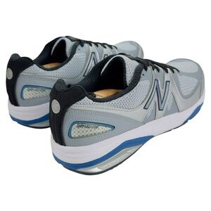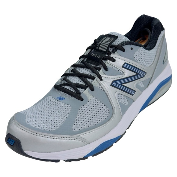 New Balance 1540v2 men's walking shoes, size 9D, in a silver and blue colorway. Model M1540SB2. These shoes are engineered for stability and support with ENCAP and Rollbar technologies, making them ideal for walking or everyday use. Pre-owned and in great condition with plenty of tread and structure remaining.